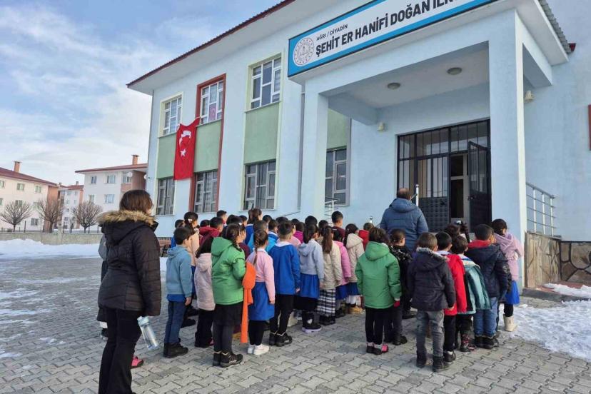 Kahramanmaraş merkezli 6 Şubat depremlerinin üçüncü yılı dolayısıyla Ağrı İl Millî Eğitim Müdürlüğü koordinesinde il genelindeki ilkokul, ortaokul ve liselerde ilk ders öncesinde bir dakikalık saygı duruşunda bulunuldu.