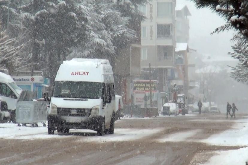 Bitlis’in Ahlat ilçesinde gece saatlerinden itibaren etkisini gösteren kar yağışı ilçeyi beyaza bürürken, kar yağışı nedeniyl...