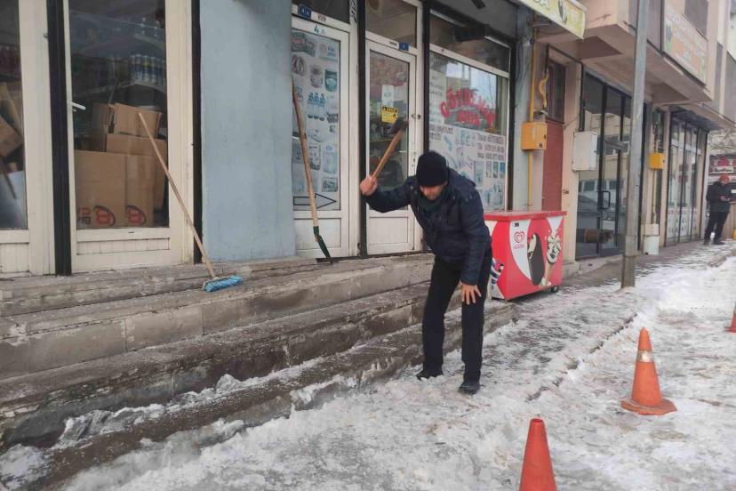 Gece saatlerinde hava sıcaklığının sıfırın altına düşmesiyle birlikte cadde ve sokaklar adeta buz pistine dönerken, özellikle iş yeri önlerinde oluşan kalın buz tabakası esnafa zor anlar yaşattı.
