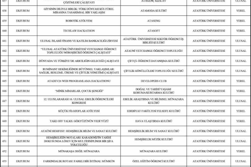 Açıklanan sonuçlara göre Atatürk Üniversitesi, farklı disiplinlerde hazırlanan 27 öğrenci projesinin kabul edilmesiyle Türkiye genelinde en fazla projesi desteklenen üniversiteler arasında 5. sırada yer aldı. Üniversite bünyesinde faaliyet gösteren öğrenci topluluklarının hazırladığı projeler; kültür, sanat, teknoloji, sağlık, sosyal sorumluluk ve bilimsel etkinlikler gibi çok çeşitli alanları kapsayarak dikkat çekti.