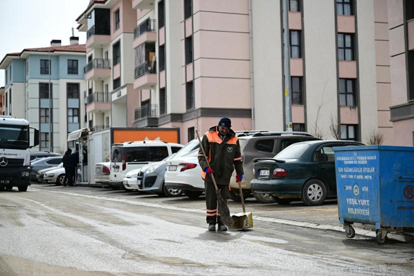 Yeşilyurt Belediyesi Temizlik İşleri Müdürlüğü ekipleri, deprem sonrası inşa edilen ve vatandaşların yeni yaşam alanı haline gelen İkizce 1.