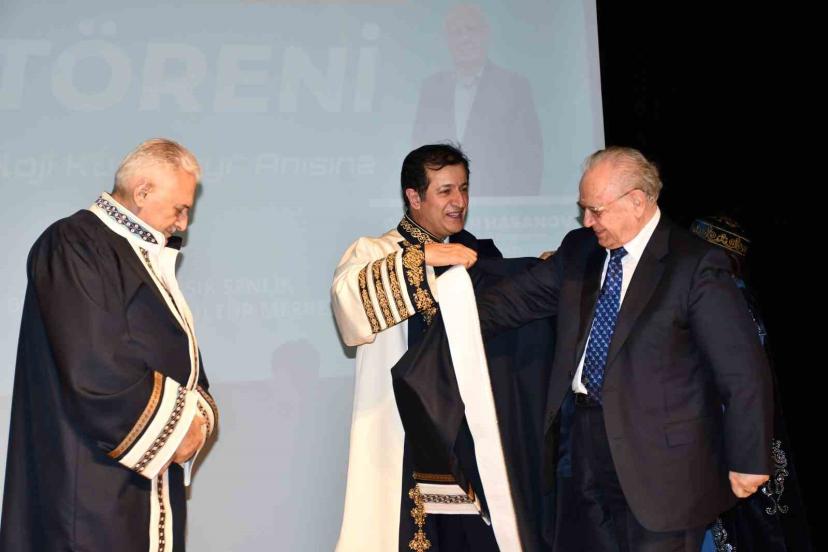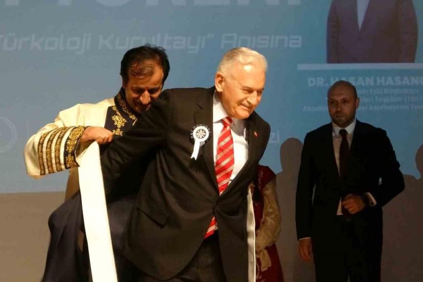Konuşmaların ardından Rektör Emiroğlu tarafından Binali Yıldırım’a ve AK Sakallar konseyi Azerbaycan temsilcisi Dr. Hasan Hasanov’a fahri doktora ünvanı verilip cübbe giydirildi.