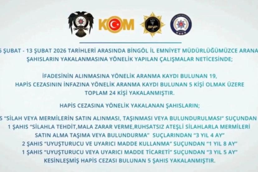 Bingöl İl Emniyet Müdürlüğü tarafından 6–13 Şubat 2026 tarihleri arasında il genelinde yürütülen aranan şahısların yakalanmasına yönelik yürütülen çalışmalar kapsamında önemli sonuçlar elde edildi. Bu kapsamda, ifadesinin alınmasına yönelik aranma kaydı bulunan 19 kişi ile hapis cezasının infazına yönelik aranma kaydı bulunan 5 kişi olmak üzere toplam 24 kişi yakalanarak adli işlemlere başlandı. Öte yandan aynı tarihlerde Terörle Mücadele, Narkotik Suçlarla Mücadele ve Asayiş Şube Müdürlükleri tarafından yürütülen çalışmalar kapsamında ise çeşitli suçlardan 23 şüpheli şahıs yakalandı. Yakalanan şüphelilerden 18’i serbest bırakılırken, 3 şüpheli şahıs adli kontrol şartıyla serbest bırakıldı.