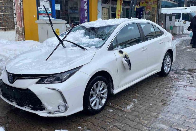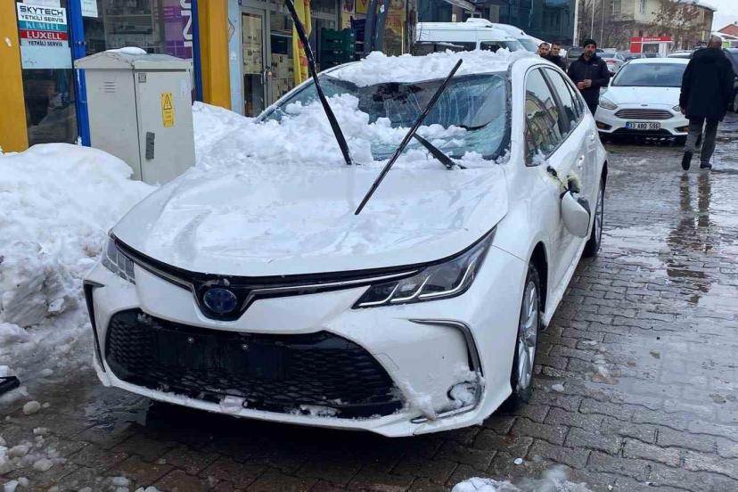 Bingöl’ün Karlıova ilçesinde havaların yumuşamasıyla çatıdan düşen kar kütlesi, park halindeki araca zarar verdi.