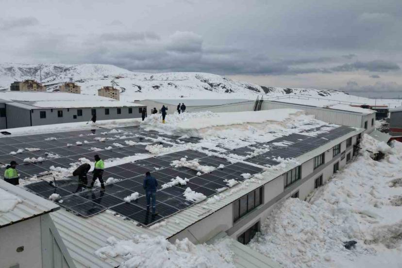 Bitlis Organize Sanayi Bölgesi’ndeki bazı fabrikalarda yoğun kar yükü, çatıdaki güneş enerjisi panellerinde hasara yol açtı. İşletme sahipleri, hem mevcut panellerin korunması hem de zarar görenlerin yenilenmesi için ilginç bir yöntem bularak çalışma başlattı. Yoğun kar birikimi nedeniyle insan gücüyle yapılması planlanan temizlik, vinç ucuna bağlanan özel bir aparat sayesinde kısa sürede tamamlanacak. Normalde 10 gün sürecek temizlik işlemi, vinç ve aparat ile yalnızca 2 günde gerçekleştirilecek.