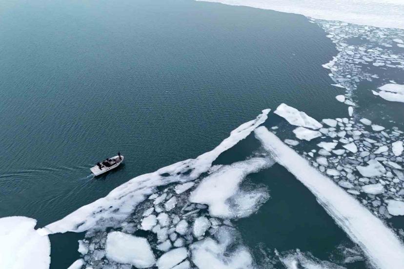 Bitlis’in Ahlat ilçesinde kış mevsiminde dondurucu soğuk nedeniyle yüzeyi buz tutan Nazik Gölü’nün çözülmeye başlamasıyla balıkçı tekneleri avlanmak için göle açılmaya başladı.