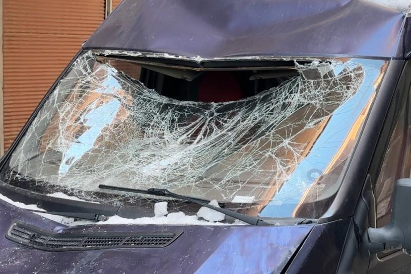 Çatıdan düşen kar kütlesi seyir halindeki minibüse zarar verdi