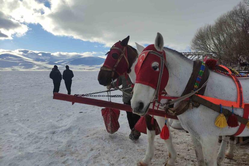 Yüzeyi tamamen donan Çıldır Gölü’ne gelen turistler, kar ve buz üzerinde halay çekti, atlı kızakla gezinti yaptı.