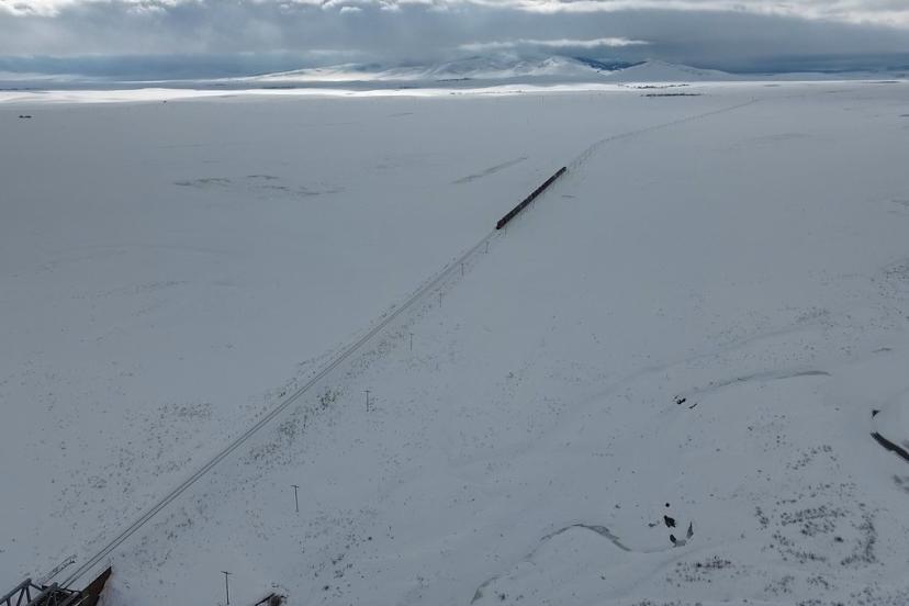 Kars’ın Selim ilçesi sınırlarında yer alan tarihi Benliahmet İstasyonu, bu devasa yolculuğun en önemli duraklarından biri oldu. Gökyüzünün masmavi rengiyle birleşen bembeyaz kar örtüsü, yeşil çam ağaçlarıyla birleşince ortaya çıkan kontrast, dron kamerasınca saniye saniye kaydedildi. Adeta karların üzerinde dans edercesine ilerleyen yük treni, Doğu Anadolu’nun sert ama mağrur coğrafyasında yoluna devam ediyor.