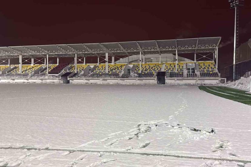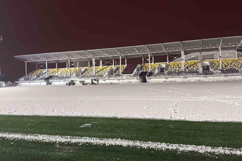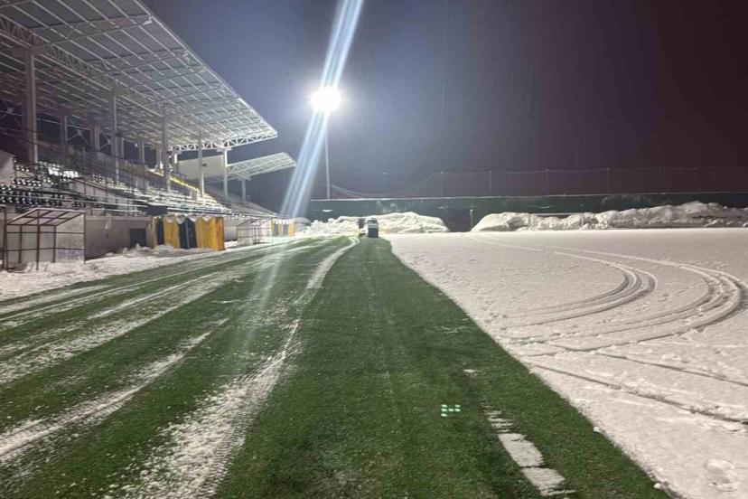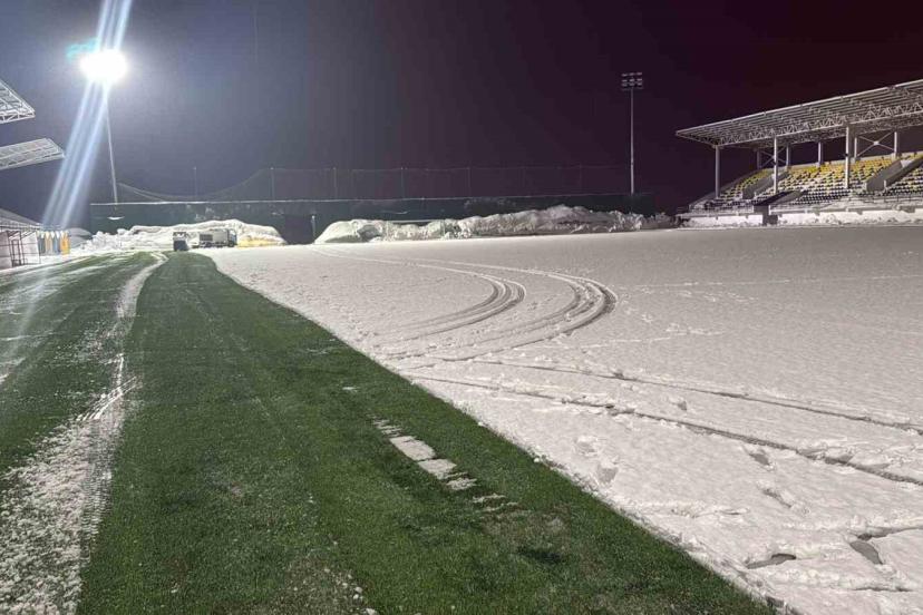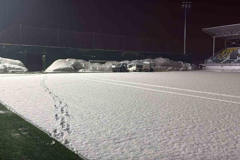 Ekipler, karşılaşmanın sorunsuz bir şekilde oynanabilmesi için sahada biriken karları temizleyerek zemini futbol oynamaya uygun hale getirmek için çalışmalarını sürdürüyor.