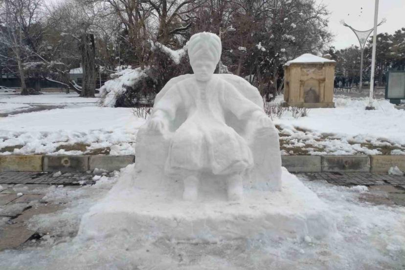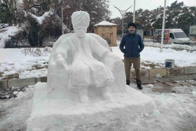 Erzincan’da kar yağışını sanata dönüştüren Güzel Sanatlar Fakültesi mezunu İsmail İşler, klasik kardan adam yerine kardan padişah yaptı.