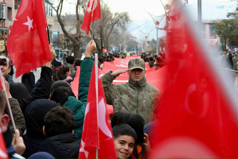 Erzincan il protokolü, öğrenciler ve vatandaşlar Türk bayraklarıyla kentin farklı noktalarından yürüyüşe katıldı. Program kapsamında Ordu, 13 Şubat, Fevzipaşa ve Halitpaşa Caddeleri üzerinden eş zamanlı olarak yürüyüşe geçen öğrenciler, Mehmetçikler ve vatandaşlar omuzlarında ay yıldızlı bayraklarla Erzincan’ın merkezi noktası olan Dörtyol Meydanı’nda buluştu. Şehrin dört bir yanından gelen katılımcılar, birlik ve beraberlik mesajı verdi.