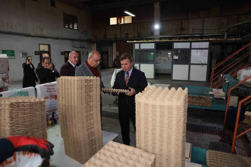 Üretim alanlarını gezen Vali Aydoğdu, tesiste 20 ve 30 adetlik yumurta viyollerinin üretim aşamalarını yerinde inceledi.