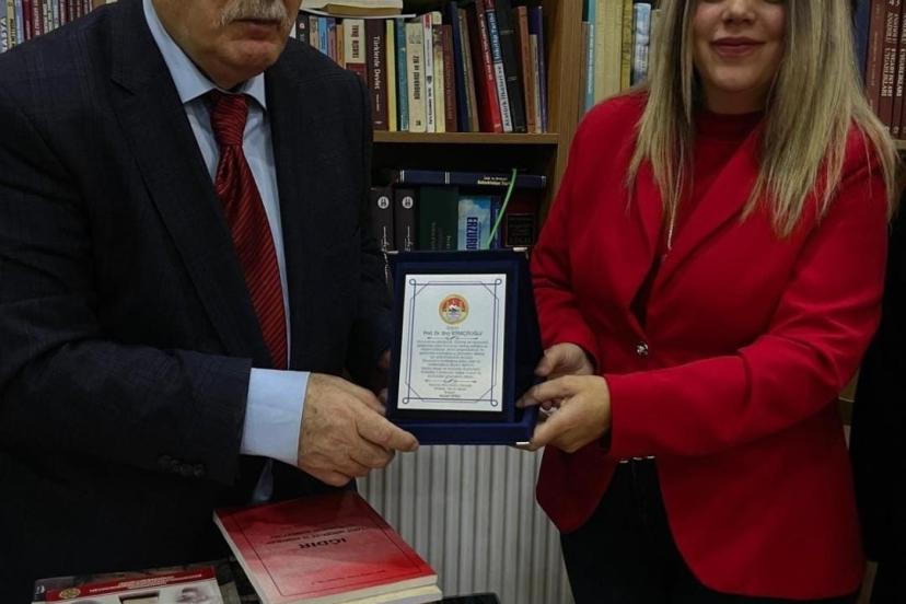 Program kapsamında Prof. Dr. Erol Kürkçüoğlu’na plaket takdim edilirken, ziyaretin sonunda Kürkçüoğlu, Ermeni mezalimini konu alan eserlerinden birini Gamze İspirli’ye hediye etti. Anlamlı buluşma, hatıra fotoğrafı çekimiyle sona erdi.