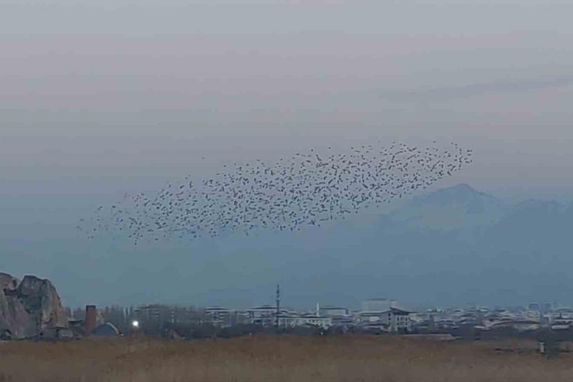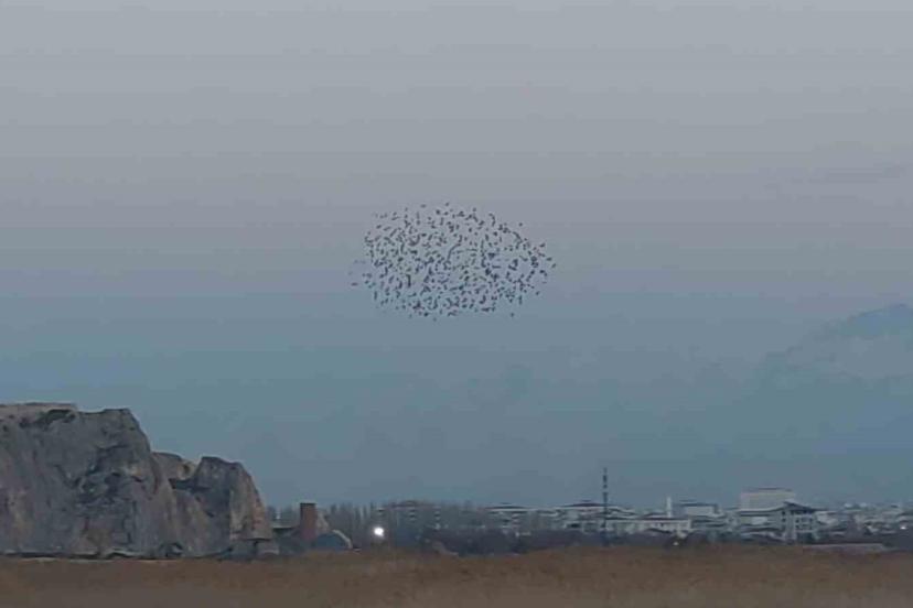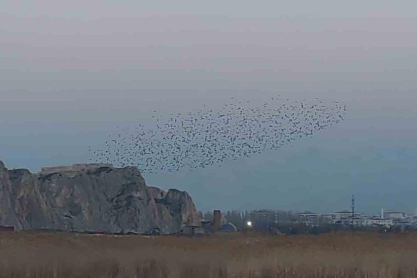 Van’da akşam saatlerinde yüzlerce sığırcık kuşu, tarihi Van Kalesi’nin güneyinde ahenk içinde uçarak görsel şölen sundu.