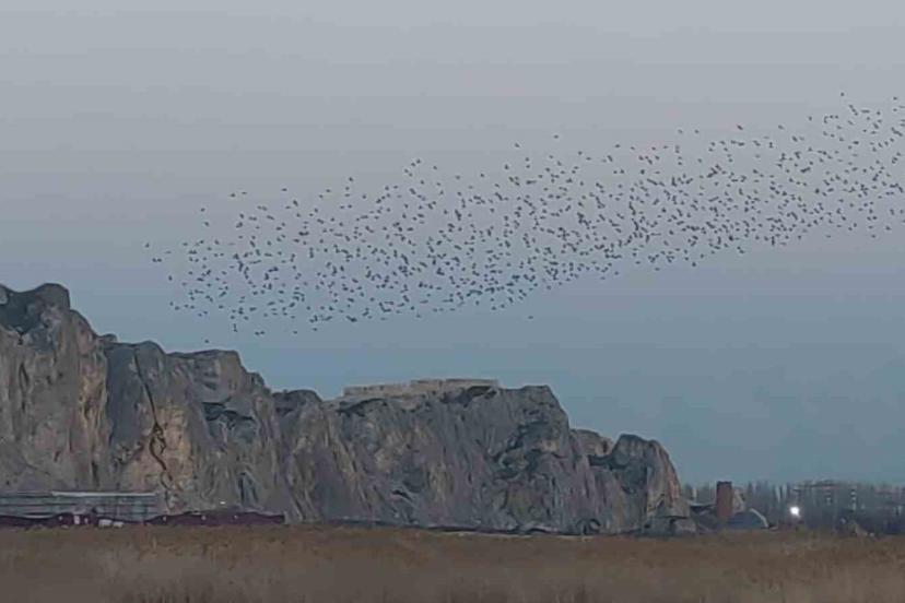 Urartu Krallığı’nın mirası tarihi Van Kalesi bu kez gökyüzünü siyah bir tül gibi saran sığırcık kuşlarının dansıyla dikkat çekti. Kalenin güney kısmında akşam saatlerinde bir araya gelen yüzlerce sığırcık, görsel bir şölen sundu.
