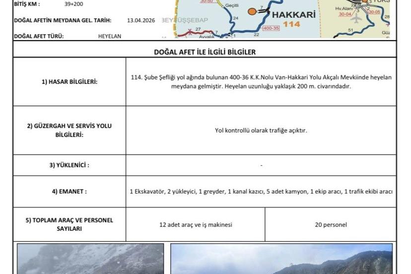 Hakkari Valiliğinden yapılan açıklamada, 13 Nisan 2026 tarihinde Hakkari-Van kara yolunun Akçalı mevkiinde heyelan meydana geldiği belirtildi. 114. Şube Şefliği yol ağı içerisinde bulunan 400-36 K.K. numaralı güzergahta oluşan heyelanın yaklaşık 200 metre uzunluğundaki bir alanda etkili olduğu bildirilen açıklamada, heyelanın ardından ilgili kurum ve ekiplerin hızla bölgeye sevk edildiği, yol güvenliği ve ulaşımın devamlılığının sağlanması amacıyla gerekli tedbirlerin alındığı ifade edildi.