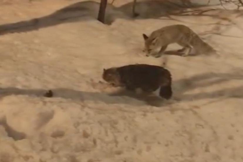 Hakkari’de tilki ile kedinin şaşırtan görüntüsü