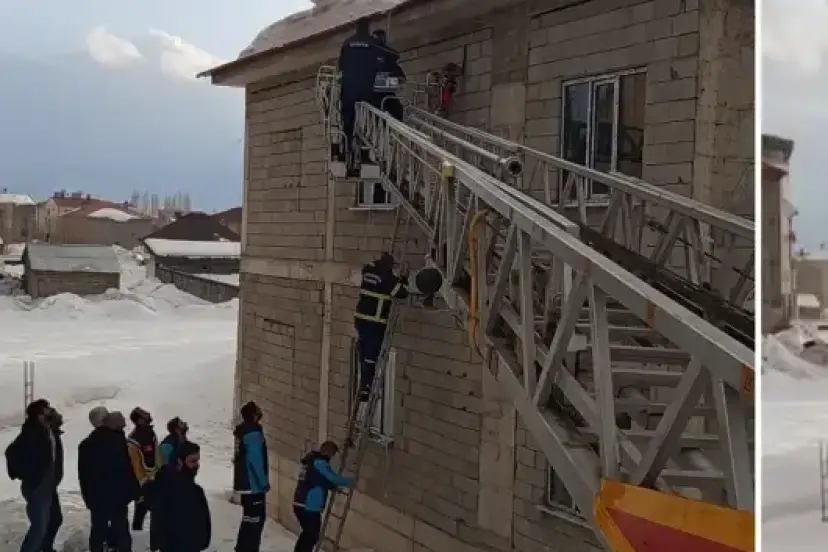 Hakkari'nin Yüksekova ilçesinde kar temizlemek için çıktığı evinin çatısında, ayağının kayması sonucu beline bağladığı iple asılı kalan kişi, itfaiye ekiplerince kurtarıldı.