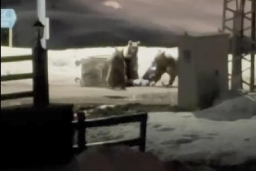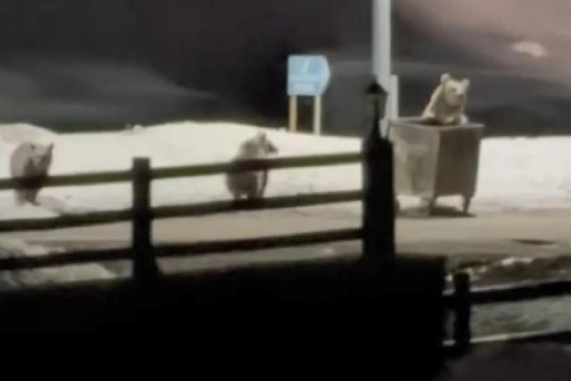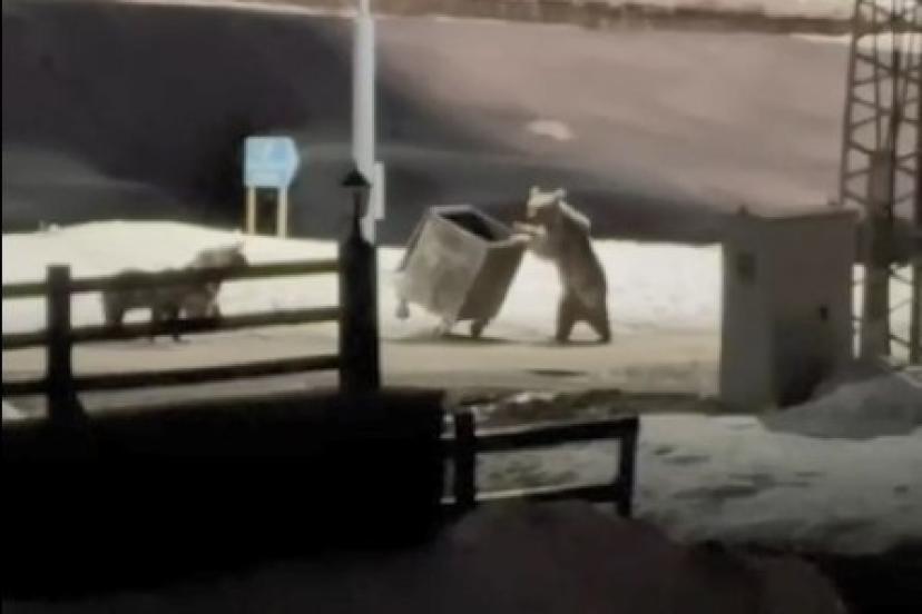 Kış uykusundan uyanan anne ayı ve yavruları, yerleşim yerine gelerek çöp konteynırlarını karıştırmaya başladı. Etrafı dikkatlice kontrol eden anne ayı çöp konteynerini çekerek devirdi. Daha sonra bir poşeti alarak uzaklaştı. O anda bölgede bulunan vatandaş ise anne ayı ve yavrularını cep telefonuyla kaydetti.