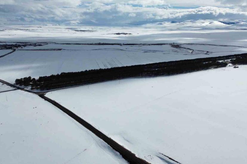 Bölgedeki geniş tarım arazileri de yoğun kar yağışından nasibini aldı. Bahar ekim sezonuna hazırlanan tarlalar, kalın kar tabakasıyla tamamen örtülerek adeta beyaz bir denizi andırdı. Havadan çekilen görüntülerde, karla kaplı arazilerin geometrik yapısı dikkat çekerken, doğanın sakinliği görenleri büyülüyor.