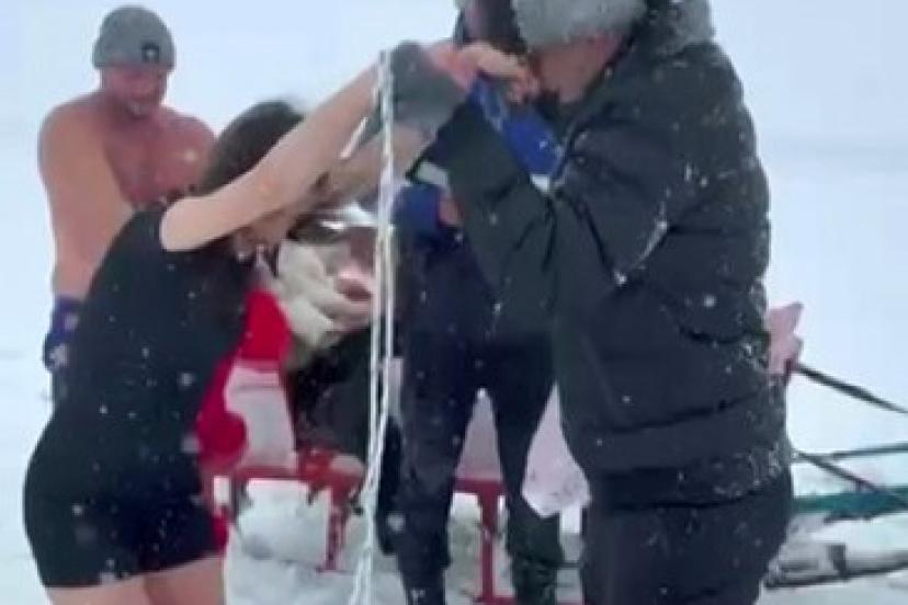 Tamamen buzla kaplanan Kars Çıldır Gölü, sıra dışı bir ana sahne oldu. Hava sıcaklığının sıfırın altında 23 dereceyi gördüğü bölgede, bir kadın ziyaretçi buzları kırdırarak dondurucu suya girdi.