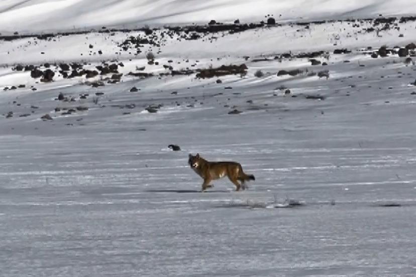 Kars-Çıldır karayolunda seyir halindeki bir sürücü, karla kaplı arazide kendisini takip eden kurdu cep telefonuyla görüntüledi.
