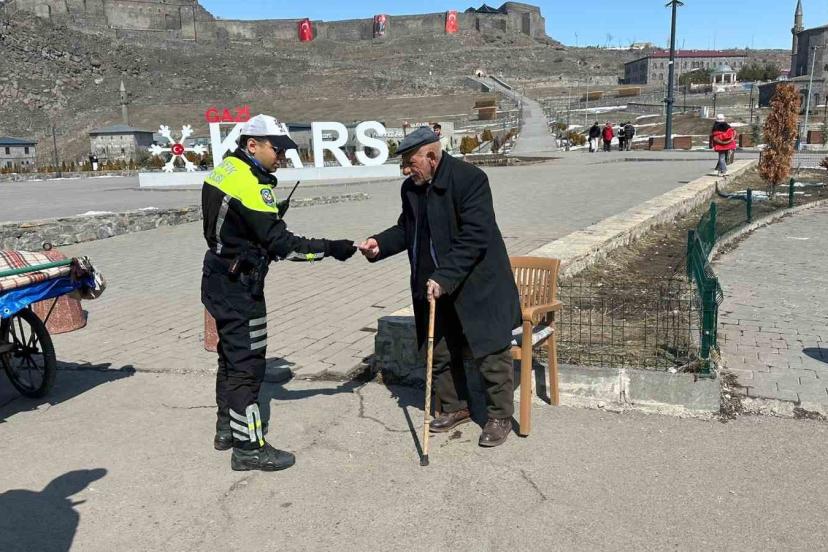 Kars Emniyet Müdürlüğü Trafik Denetleme Şube Müdürlüğü ekiplerince kent genelinde sürdürülen çalışmalar çerçevesinde sürücüler ve yayalar trafik kurallarına uymaları konusunda uyarılırken, bilinçlendirme amacıyla broşür dağıtımı yapıldı.