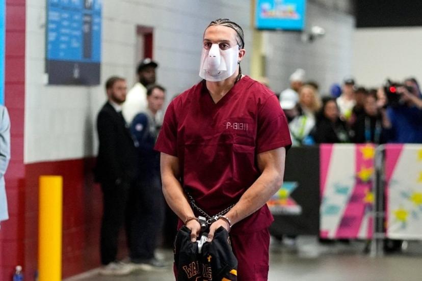 Kaliforniya eyaletinin Santa Clara kentindeki Levi's Stadı'nın koridorlarında maç öncesi görüntülenen Hollins'in tulumunda Colorado’daki yüksek güvenlikli bir hapishaneye atıfta bulunan "Range 13" yazarken 32 yaşındaki oyuncu, ellerindeki kelepçeler ve yüzündeki plastik maskeyle ilgi odağı oldu.