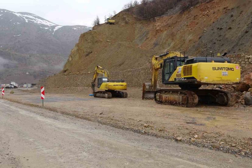 Yola düşen kayalar iş makineleri yardımıyla kaldırıldı.