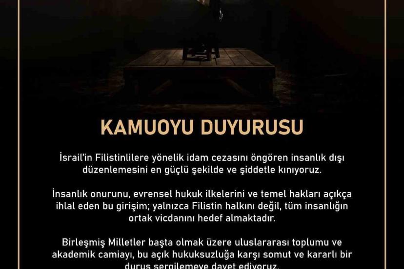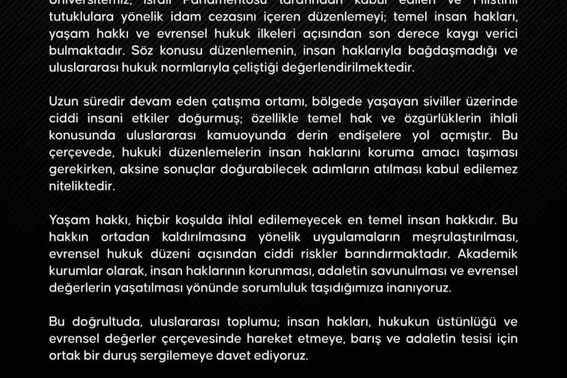 Malatya Turgut Özal Üniversitesi Rektörlüğü, İsrail Parlamentosu’nun idam cezasına ilişkin düzenlemesini insan hakları açısından kaygı verici bulduğunu belirterek, "Üniversitemiz, İsrail Parlamentosu tarafından kabul edilen ve Filistinli tutuklulara yönelik idam cezasını içeren düzenlemeyi; temel insan hakları, yaşam hakkı ve evrensel hukuk ilkeleri açısından son derece kaygı verici bulmaktadır. Söz konusu düzenlemenin, insan haklarıyla bağdaşmadığı ve uluslararası hukuk normlarıyla çeliştiği değerlendirilmektedir. Uzun süredir devam eden çatışma ortamı, bölgede yaşayan siviller üzerinde ciddi insani etkiler doğurmuş; özellikle temel hak ve özgürlüklerin ihlali konusunda uluslararası kamuoyunda derin endişelere yol açmıştır. Bu çerçevede, hukuki düzenlemelerin insan haklarını koruma amacı taşıması gerekirken, aksine sonuçlar doğurabilecek adımların atılması kabul edilemez niteliktedir. Yaşam hakkı, hiçbir şartta ihlal edilemeyecek en temel insan hakkıdır. Bu hakkın ortadan kaldırılmasına yönelik uygulamaların meşrulaştırılması, evrensel hukuk düzeni açısından ciddi riskler barındırmaktadır. Akademik kurumlar olarak, insan haklarının korunması, adaletin savunulması ve evrensel değerlerin yaşatılması yönünde sorumluluk taşıdığımıza inanıyoruz. Bu doğrultuda, uluslararası toplumu; insan hakları, hukukun üstünlüğü ve evrensel değerler çerçevesinde hareket etmeye, barış ve adaletin tesisi için ortak bir duruş sergilemeye davet ediyoruz. Kamuoyuna saygıyla duyurulur" ifadelerini paylaştı.