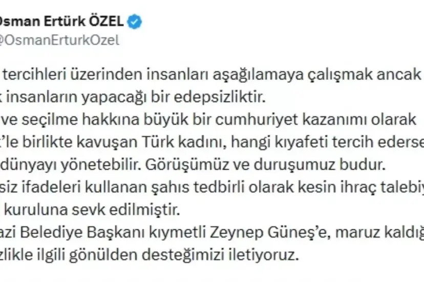 İYİ Parti Genel Sekreteri Osman Ertürk Özel, kıyafet tercihleri üzerinden insanları aşağılayan bir üslup benimseyen bir şahsın kesin ihraç talebiyle disiplin kuruluna sevk edildiğini duyurdu ve Türk kadınlarının seçme ve seçilme haklarına vurgu yaptı.