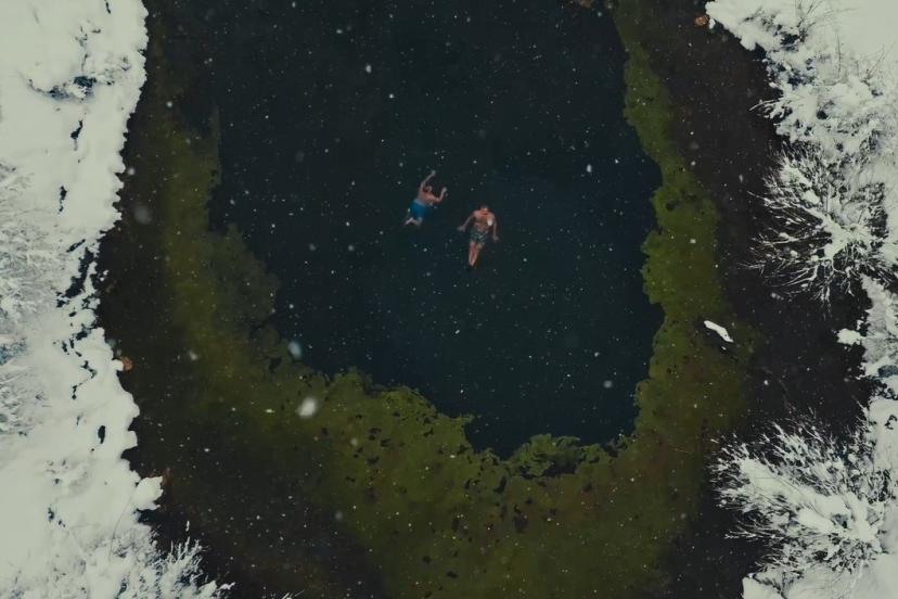 Muhteşem manzarada üç arkadaş kar yağışı altında gölette yüzdü