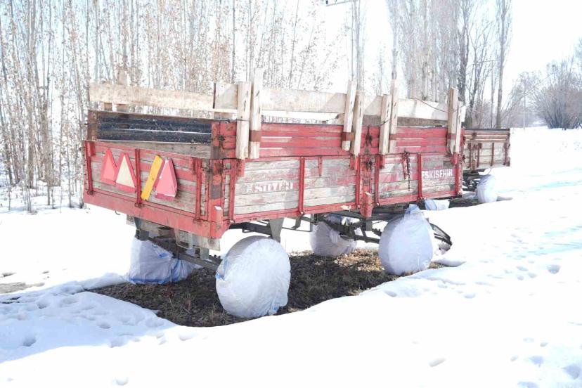 Muş’taki çiftçiler, dondurucu soğukların tarım araçlarına zarar vermemesi için traktör ve römork lastiklerini çeşitli yöntemlerle koruma altına alıyor.