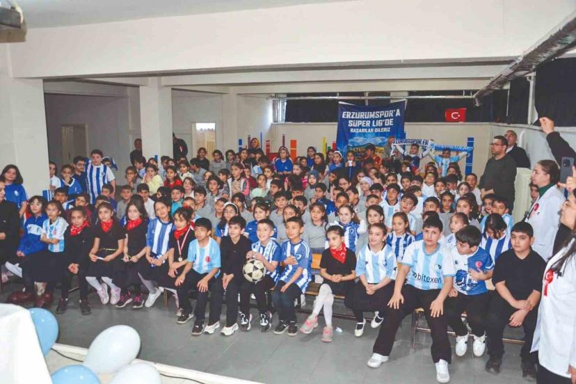 Erzurumspor’un başarılı futbolcuları Kaptanı Mustafa Yumlu ve Sefa Akgün, Evliya Çelebi İlköğretim Okulu’nu ziyaret ederek çocukları sevince boğdu.