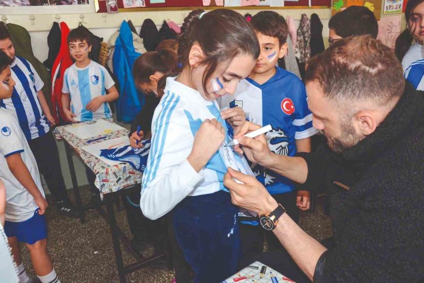 Çocuklarla bir anda sarmaş dolaş olan Kaptan Yumlu ve Sefa Akgün daha sonra giyilen formaları imzaladı ve spor salonunda üç ve dördüncü sınıflarla bir araya geldi. Çocukların birbirinden ilginç sorularını yanıtlayan Kaptan Yumlu ve Akgün, öğretmen ve öğrencilerle bol bol fotoğraf çektirerek forma imzaladı.