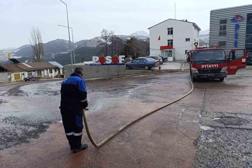 ilçesinde havaların ısınması ve Ramazan ayına girilmesi nedeniyle temizlik çalışması başlatıldı. Eriyen kar ile birlikte oluşan kum ve çamurlar, itfaiye ekipleri tarafından tazyikli suyla temizlendi.