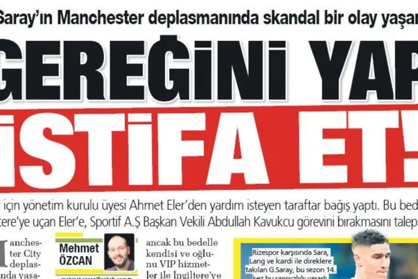 G.Saray'ın M.City ile deplasmanda oynadığı maça bir taraftarın götürülmesi için kulübe zorunlu bağış yaptırıldığı ortaya çıkmıştı. Sportif AŞ bağımsız yönetim kurulu üyesi Ahmet Eler'in, bu ücretle kendisi ve oğlunu VIP olarak İngiltere'ye götürdüğü iddia edilmişti. Bu iddiayı SABAH Spor önceki gün sayfalarından duyururken Ahmet Eler dün bir açıklama ile istifa etti: "Yurt dışı organizasyonuna ilişkin tutar, taraflar arasındaki mutabakat doğrultusunda ilgili kişinin yardımcısı Barış Bey'e nakden ve eksiksiz teslim edilmiştir.