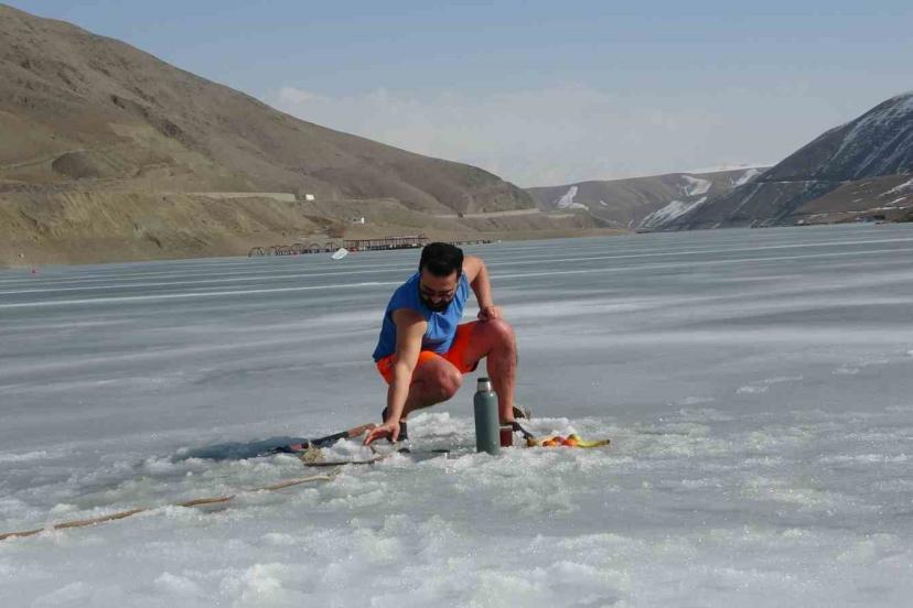 Van’da sıra dışı etkinlikleriyle tanınan maceracı bir öğretmen, barajdaki suyun buz tutmuş yüzeyini kırarak suya girdi. Balık avlamak yerine buzlu suyun içinde çay içen öğretmen, hem sağlıklı yaşama hem de kentin kış turizmine dikkat çekti.
