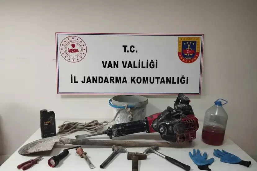 İl Jandarma Komutanlığına bağlı Erciş İlçe Jandarma Komutanlığı ekipleri, Çelebibağı Mahallesi mevkiinde yürüttükleri devriye faaliyetleri sırasında, kaçak kazı yapıldığını tespit etti. Yapılan çalışmada şüpheliler B.B., (27), H.B., (30), T.A., (29) ve Y.G., (28) kaçak kazı yaptıkları sırada suçüstü yakalandı. Bölgede yapılan aramada 1 adet benzinli kırıcı hilti, 1 kürek, 5 litrelik şişe içerisinde benzin, motor yağı, 3 çekiç, 1 murç, 1 kova, 1 el feneri, 1 pense, 2 çift eldiven ile 10 metre uzunluğunda ip ele geçirildi. Şüpheliler hakkında, 2863 Sayılı Kültür ve Tabiat Varlıklarını Koruma Kanunu'na muhalefet suçundan adli işlem başlatıldı.
