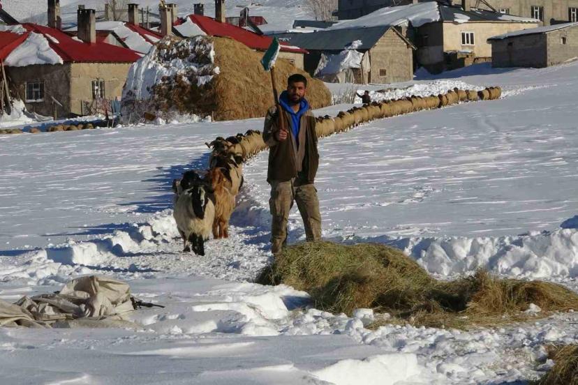 Van’ın Çatak ilçe kırsalında besiciler kar yağışı ve soğuk havaya rağmen zorlu mesailerini sürdürüyor.