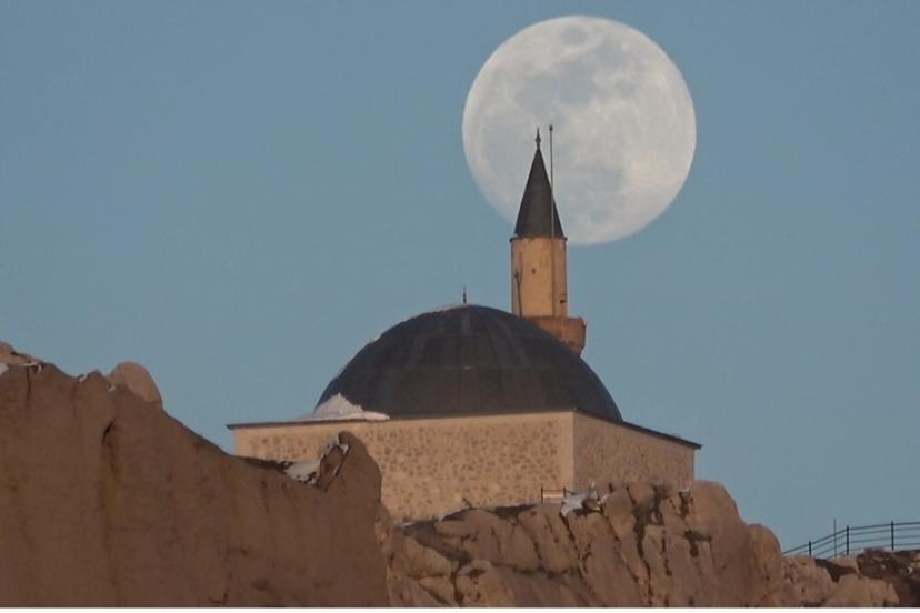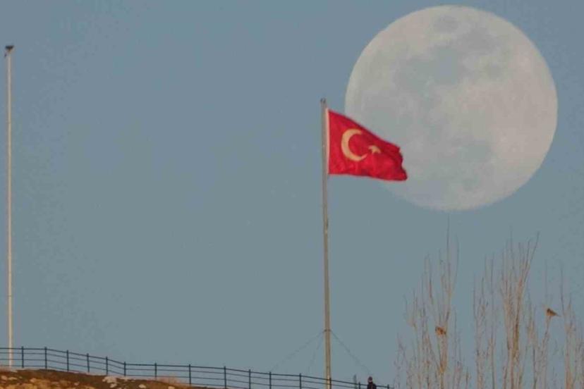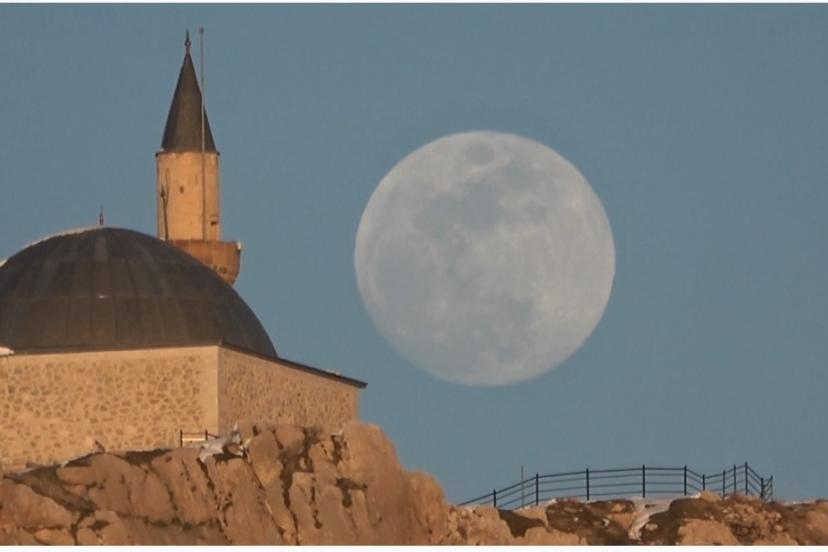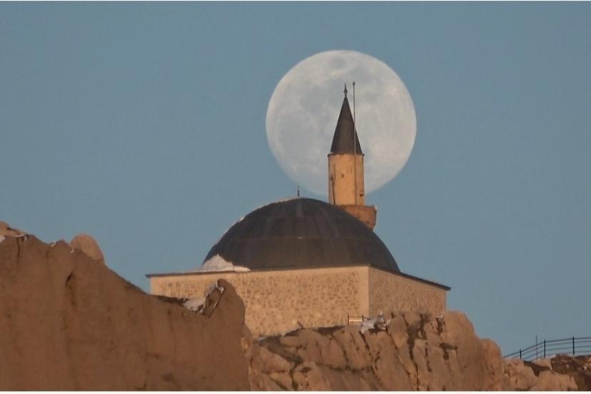 Türkiye’nin en doğusunda, güneşin en görkemli veda ettiği şehirlerden biri olan Van’da, bugün de gökyüzü nöbeti büyük bir zarafetle devredildi. Van Gölü’nün uçsuz bucaksız maviliği üzerinde batan güneş, yerini gecenin sultanı aya bıraktı. Güneşin ufuk çizgisinin altına inmesiyle birlikte, nöbeti devralan ay, Erek Dağı’nın üzerinden tüm heybetiyle yükseldi. Gökyüzünün derin maviliğinde parlayan ay, geceyi aydınlattı.