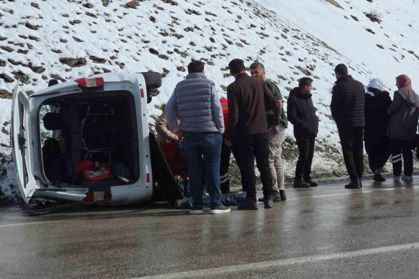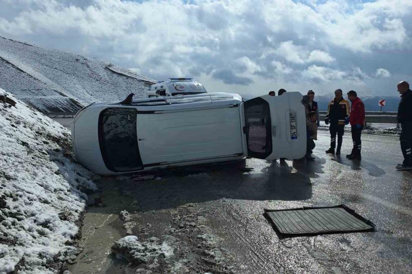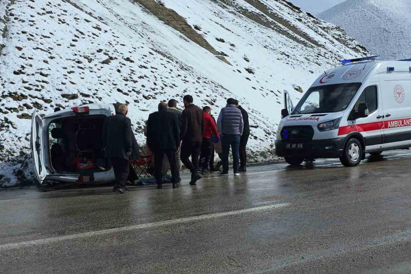 Van’da kaygan yolda devrilen hafif ticari kamyonette 1 kişi yaralanırken sürücü, eşi ve çocuğu yara almadan kurtuldu.