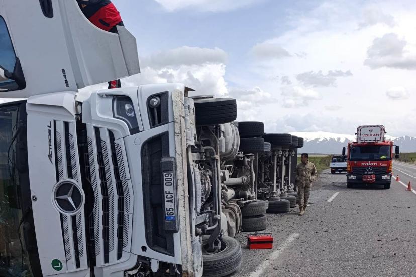 Van-Erciş kara yolu üzerinde toprak yüklü tırın devrilmesi sonucu meydana gelen trafik kazasında 1 kişi yaralandı.