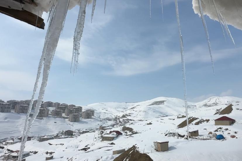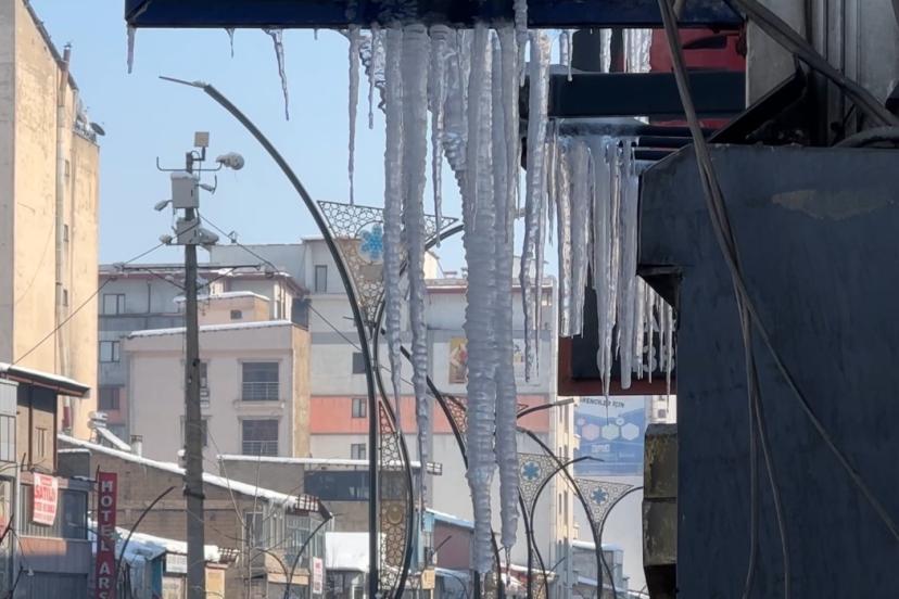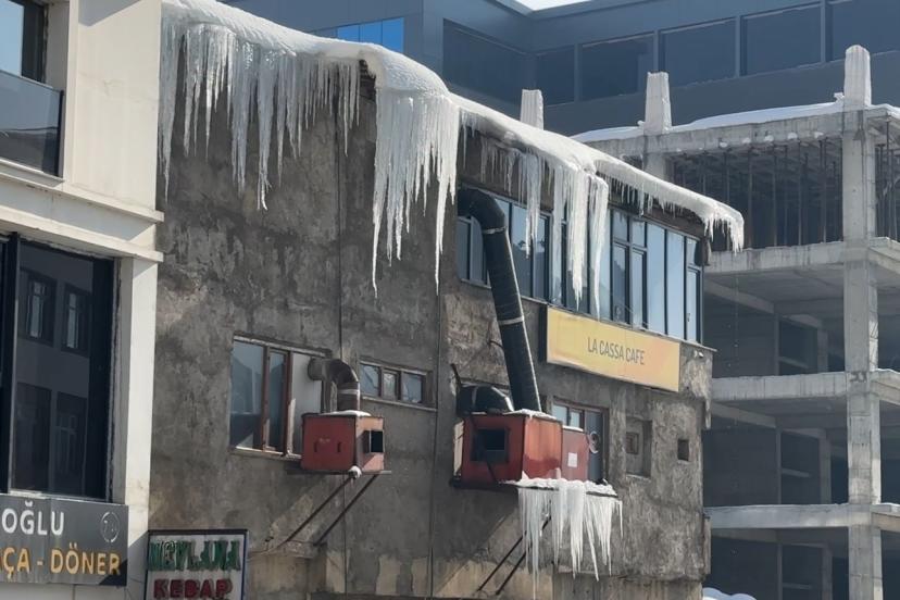 Hakkari’nin Yüksekova ilçesinde etkili olan dondurucu soğuklar yaşamı olumsuz etkilerken, bina çatılarında dev buz sarkıtları oluştu.